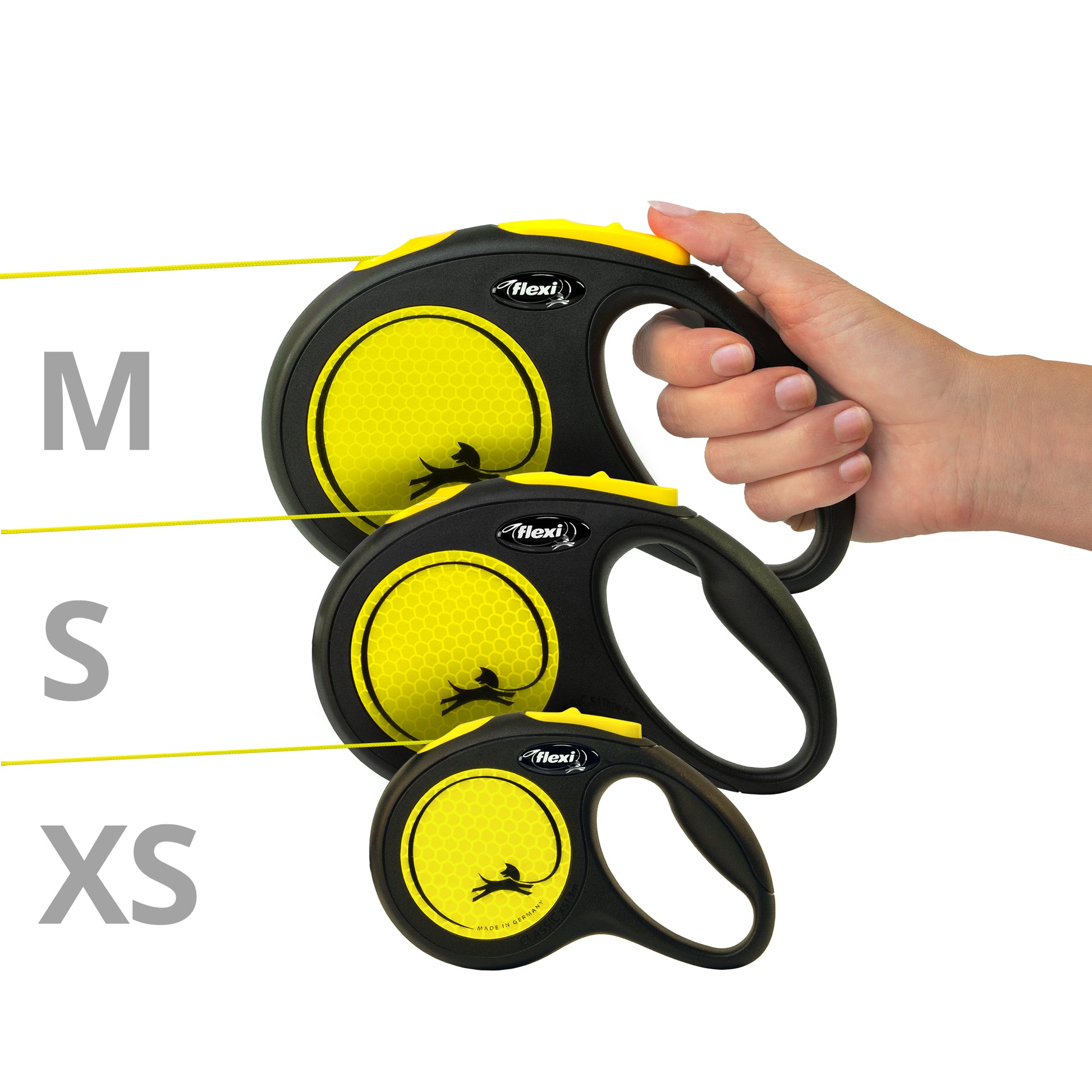flexi(フレキシ)は小型犬用のXS(xsサイズ)、Sサイズ、中型犬向けのMサイズ、大型犬向けのLサイズ、XLサイズまで。紐の長さは3m、5m/5メートル、8m/8M、10mまでのロングリードまで。